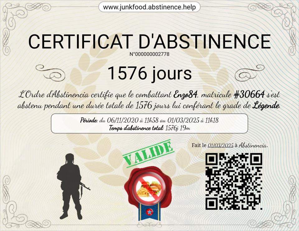Soit un total de 52 jours de no fast foodNuevo rango obtenido: Caporal-chef - J9 10 jours de no fast food facile + 35 jours en réalité = 45 jours de no fast food je me suis détaché de cet addiction !
